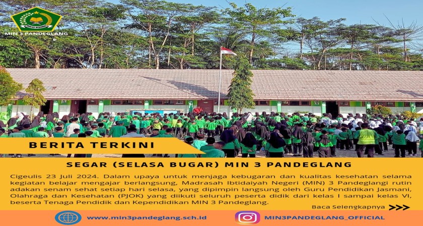 Dalam rangka menjaga kebugaran dan kualitas kesehatan selama kegiatan belajar mengajar berlangsung, Madrasah Ibtidaiyah Negeri (MIN) 3 Pandeglang rutin adakan senam sehat setiap hari selasa yang dipimpin langsung oleh Guru Pendidikan Jasmani, Olahraga dan Kesehatan Bpk. Agi Priatna, M.Pd diikuti seluruh siswa/i beserta Tenaga Pendidik dan Kependidikan MIN 3 Pandeglang.